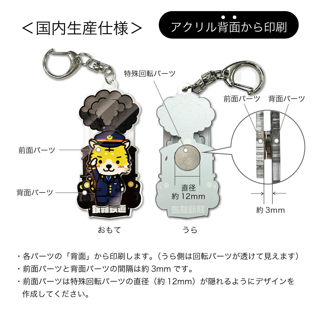 形状は自由自在&高品質プリントで美しい仕上がりのオリジナル くるくる回転アクキーです