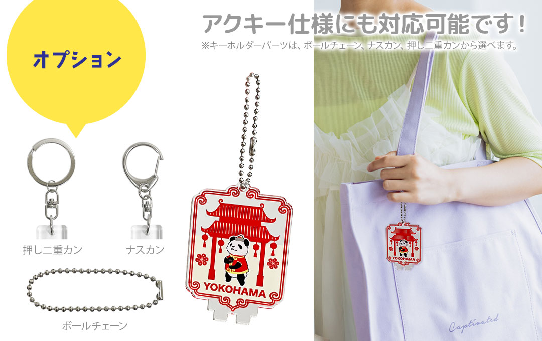 選べるパーツは、定番で使いやすいボールチェーン、バッグやポーチに簡単に装着できるナスカン、耐久性に優れた押し二重カンの3種類。デザインや利用シーンに合わせて最適な仕様を選べることで、グッズ展開の幅が大きく広がります。