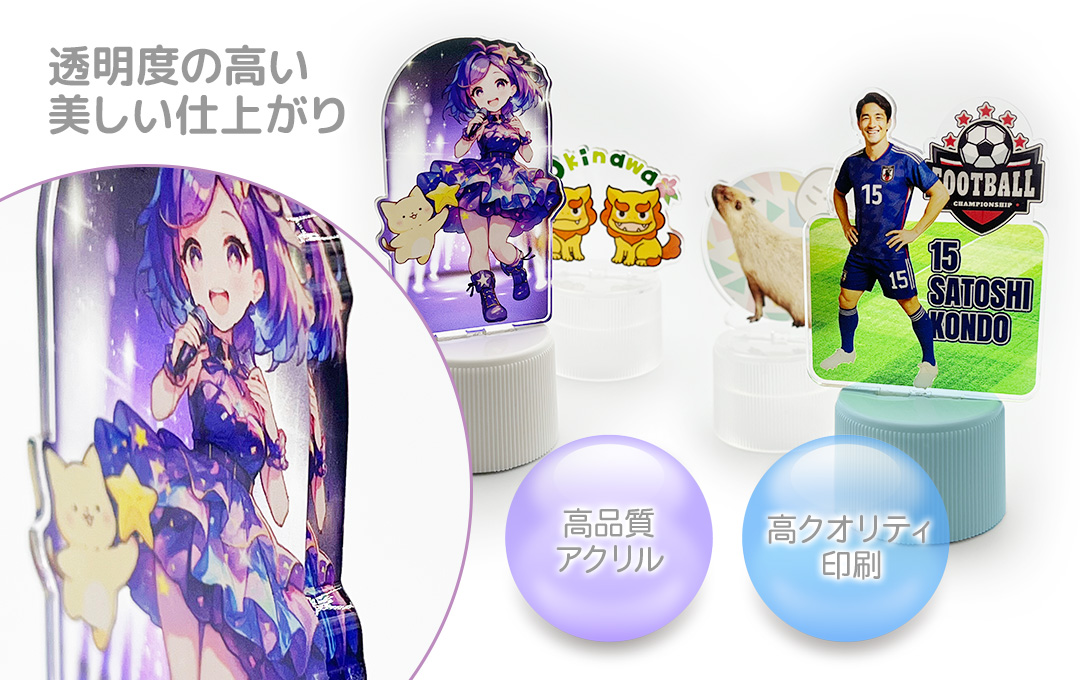 高透明クリアアクリルと高精細フルカラー印刷により、オリジナル ボトルキャップアクスタを美しく高品質に仕上げます。