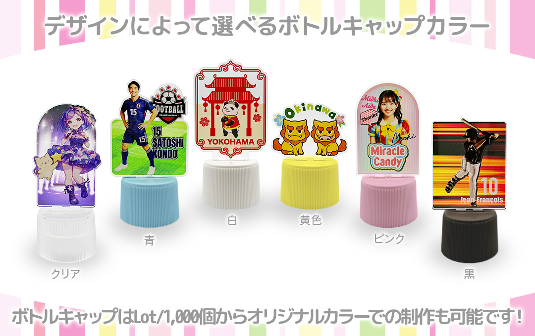オリジナル ボトルキャップアクスタは全6色のキャップカラーから選べ、デザインに最適な組み合わせで制作できます。