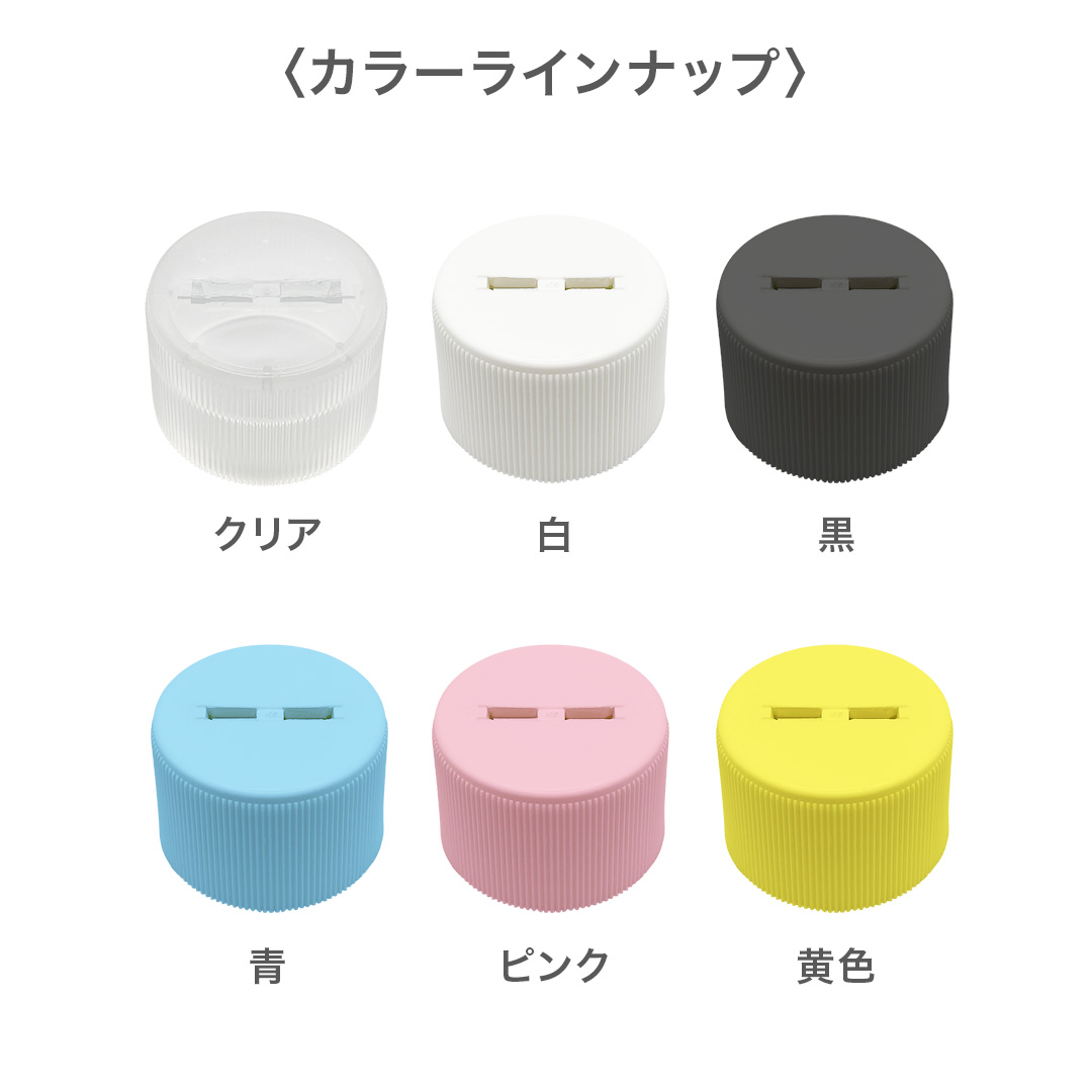 ボトルキャップ部分は、透明感のあるクリアの他、白・黒・ピンク・黄色・青(いずれも不透明)の全6色をご用意しています。