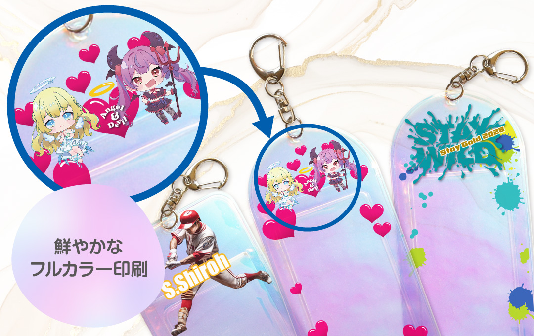 鮮やかなフルカラー印刷で、キャラクター・ロゴ・写真などを自由に表現でき、販促から物販まで幅広い場面で“推し活グッズ”として活躍します。