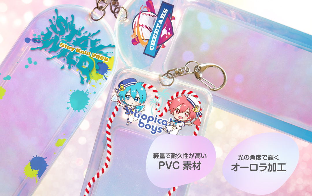 光の角度で輝くPVCオーロラ素材が“写真映え”を後押しし、会場での撮影やSNS投稿に強くアピール。ファンが推しをより魅力的に見せたいシーンと相性抜群です。公式ツアーグッズやフェスグッズ、イベント限定物販、さらに特典グッズ・ランダム販売など幅広い施策に活用でき、OEMでのシリーズ展開にも向いています。コンパクトに持ち歩けるため記念性も高く、推し活ユーザーの心をしっかりつかむ“売れるグッズ”としておすすめです。