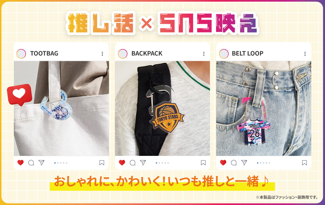 外出時にも自然と目に入りやすく動きに合わせてキャラクターやモチーフが揺れるため、写真や動画撮影の際にも映えやすいのが特長です。日常の何気ないコーディネートにも取り入れやすく、“推し”をさりげなくアピールできます。推し活グッズとしてはもちろん、キャラクターやイベントの認知拡大、キャンペーンの話題づくりにも活用しやすく、SNSでの拡散効果が期待できるトレンドグッズです。