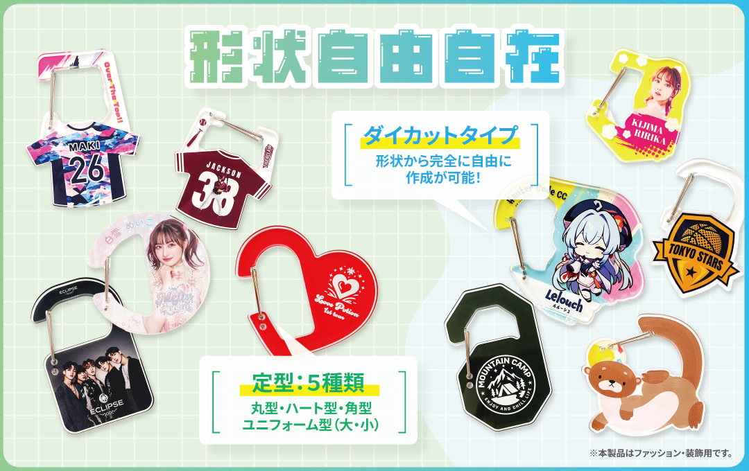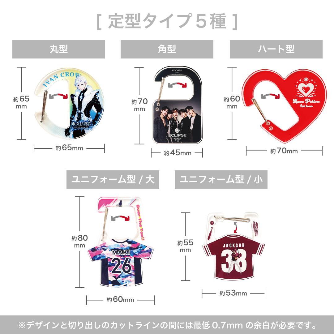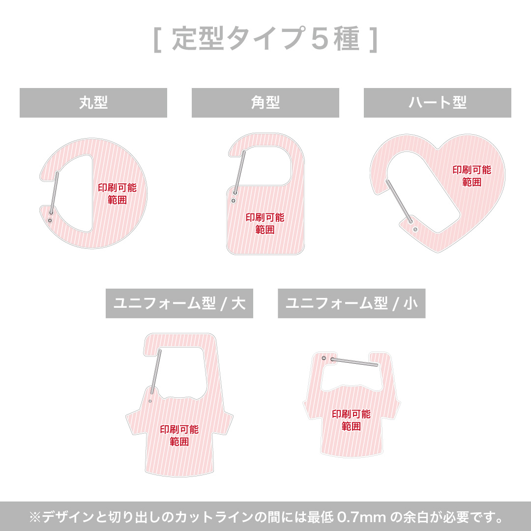 「定型タイプ」には「丸型」「ハート型」「角形」「ユニフォーム型(大)」「ユニフォーム型(小)」の5種類をご用意いたしました。カラビナのバネパーツの取り付け位置などがあらかじめ決められているので、デザインをテンプレートに配置するだけでオリジナルのアクリルカラビナを作成することができます。