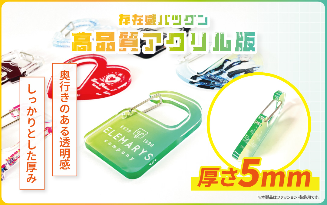 手に取った瞬間に”違い”がわかるボリュームで、高級感のあるオリジナル アクリルカラビナを制作することができます。バッグなどに装着するファッション用のカラビナアクセサリーとして、長く使える実用性を備えています。“見た目の高級感”と“長く使える耐久性”を両立した、厚み5mmならではのプレミアムな仕上がりです。(※本製品はファッション・装飾用です。)