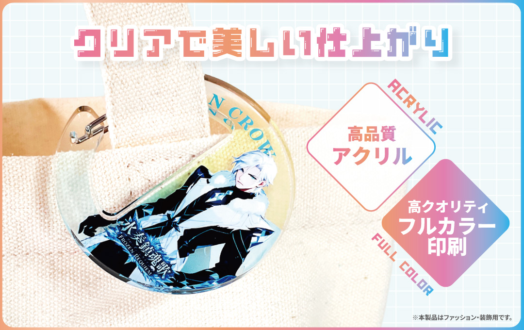 大変おすすめです。アクリルキーホルダーやアクリルスタンドと組み合わせたり、オリジナルトートバッグとセットにして展開すれば、注目度アップ間違いなしです。コレクションアイテムとして統一デザインでラインナップを揃えることで、購買意欲の向上が期待できます。