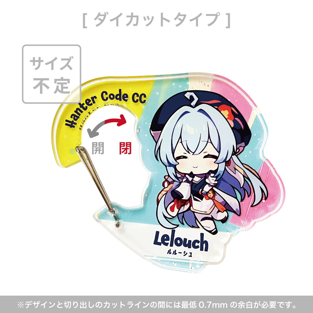 オリジナル アクリルカラビナは、バッグなどの取付時に金具パーツを開閉して使うグッズですので、細すぎるデザインや接続部分は強度に影響するため、ある程度の幅を持たせた設計が重要です。専用のテンプレートをご用意しておりますので、その指示に沿ってデザインいただけます。