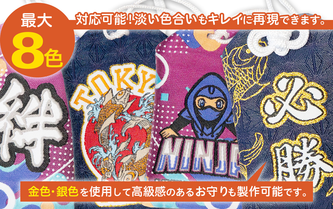 レピア織と刺繍で最大8色の糸色に対応することができますので、淡い色合いもキレイに表現可能です。また、金糸と銀糸にも対応しておりますので、金色や銀色を使用した高級感のあるお守りも製作することができます。