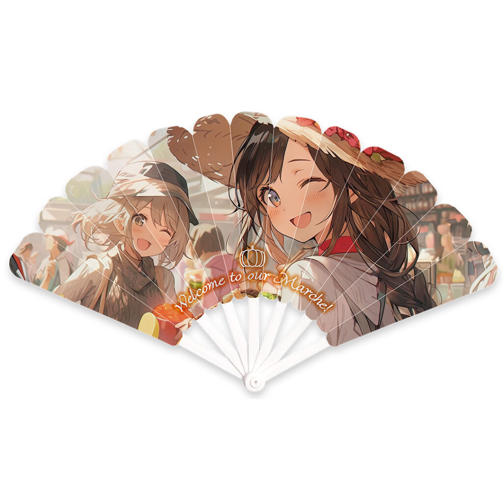 大きな扇面に全面フルカラー印刷が可能で、写真や繊細なイラストも鮮やかに再現します。一般的な紙の扇子に比べて軽量で、折りたたんでコンパクトに持ち歩ける点も嬉しいポイント。