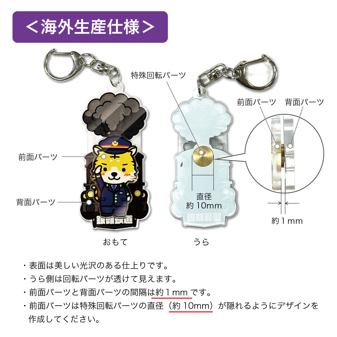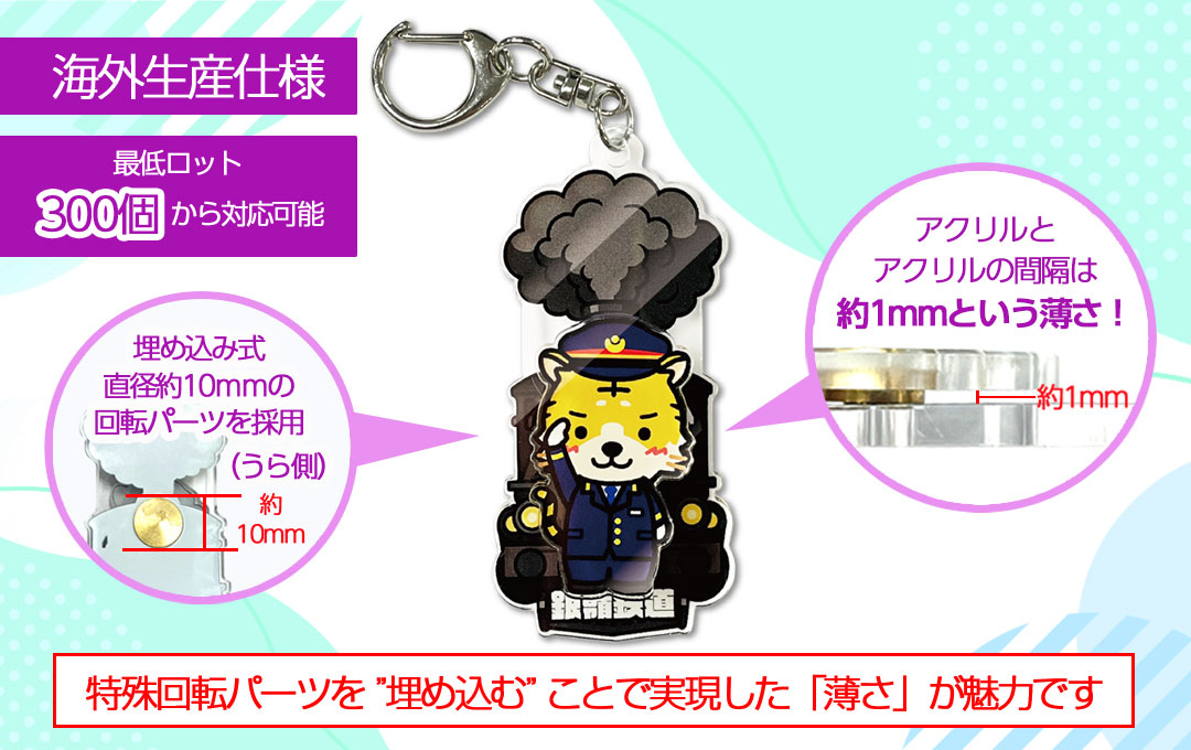 海外生産仕様の「くるくる回転アクリルキーホルダー」は、回転パーツをアクリルに埋め込むことで、前面パーツと背面パーツの間の隙間を最大限小さくした「薄さ」が魅力です。