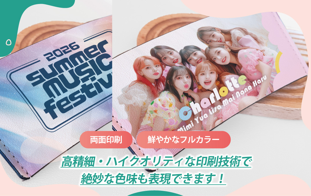 PUレザーに高品質・高画質印刷を施したマルチリストバンドを、お客様がお持ちのオリジナルのデザインにて製作いたします。オリジナルマルチリストバンドの販売に必要な資材も取り揃えておりますので、お客様にはデザインをご入稿いただくだけでオリジナル商品として販売していただくことができます。国内生産で小ロットからの製作も承っておりますので、お気軽にご相談ください。