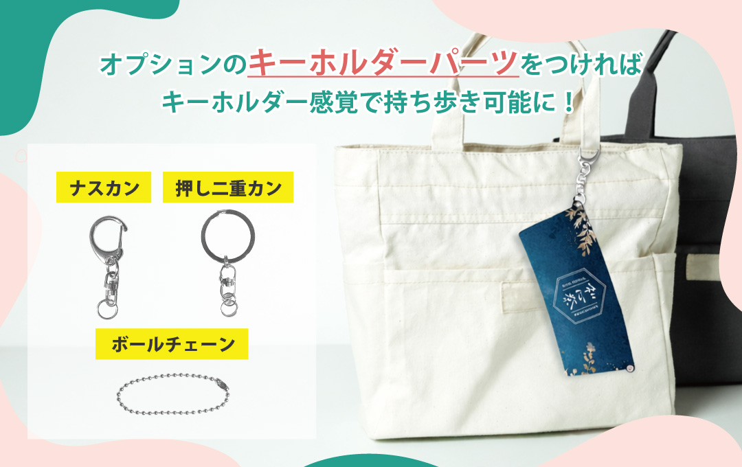 キーホルダー感覚で持ち歩きに便利なキーホルダーパーツをオプションで付属対応可能です。「ボールチェーン(シルバー)」「ナスカン」「押二重カン」の3種類からお選びいただけます。