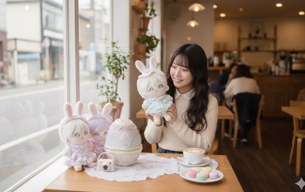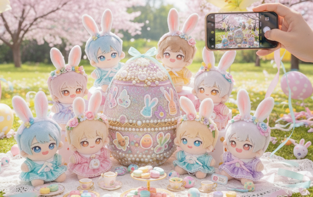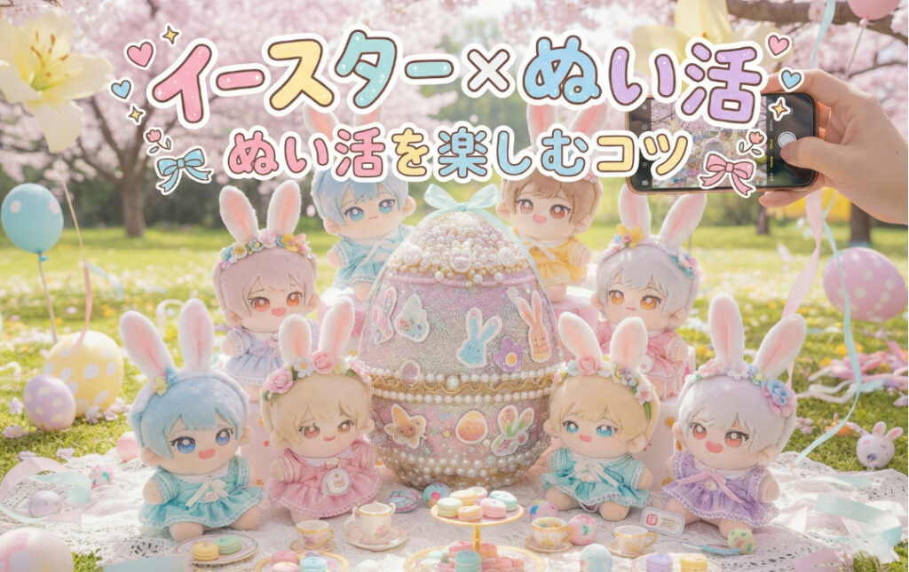 イースターのシンボルである「うさぎ(イースターバニー)」や「卵(イースターエッグ)」はとても可愛いアイテムです。ぬいぐるみに「うさ耳」を付けたり、カラフルな卵を横に添えたりするだけで、一瞬にして物語性が生まれます。これらは「生命の誕生」や「跳躍」を意味する縁起の良いモチーフでもあり、推しの新しい門出や活躍を願うファン心ともリンクします。