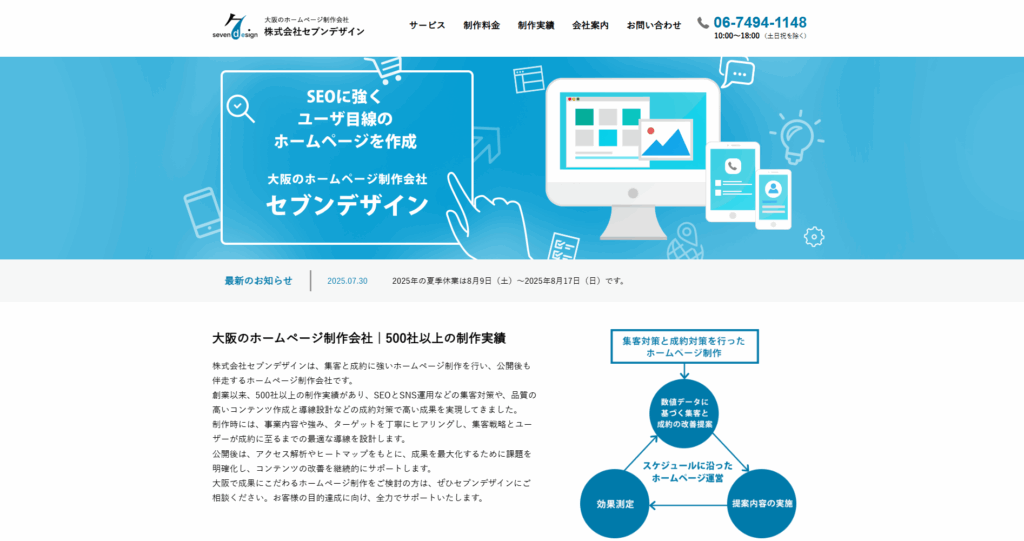 株式会社セブンデザインは、大阪市に拠点を置くホームページ制作会社で、集客力と成約率向上に特化したホームページを提供しています。
