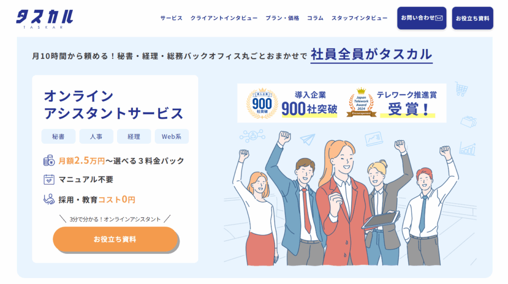 タスカルは月間10時間~、1時間あたり税込2,750円〜というリーズナブルな価格帯で、一人社長や中小企業向けにサービスを展開しています。月内で使いきらなかった稼働時間を翌月へ繰越できる点が特徴です。