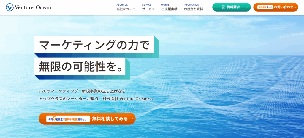 株式会社Venture Oceanは、新規事業やD2Cに特化したマーケティングコンサル会社です。株式会社Venture Oceanでは新規事業立ち上げコンサルティング、D2Cコンサルティング、商品開発コンサルティングなどのサービスを行われています。代表は1年で70億のブランドを立ち上げた経験があり、新規事業のプロが集っております。マーケティングでお悩みの方はぜひ一度、ご相談ください。